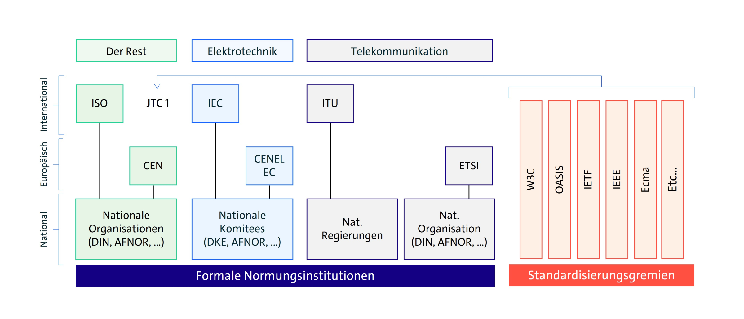 Nationale Normungsorganisationen entsenden ebenfalls Expertinnen und Experten zur Internationalen Organisation für Normung (ISO) und zum Internationalen Elektrotechnische Komitee (IEC) um internationale Normen zu entwickeln. Für die Digitalwirtschaft ist hier insbesondere das gemeinsam geführte Joint Technical Committee 1 (JTC1), wichtig, welches die Themen der Informationstechnologie bearbeitet. Die Normen von ISO und IEC haben eine besondere Relevanz für den internationalen Handel. Zwischen ISO und CEN, und zwischen IEC und CENELEC besteht jeweils ein Abkommen, nicht parallel die gleichen Normen zu entwickeln.