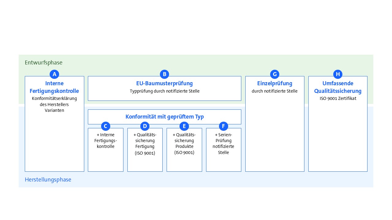Eine häufige Kombination sind Module B "EU-Baumusterprüfung" während der Entwurfsphase, und Modul C "Interne Fertigungskontrolle" während der Herstellungsphase. Modul B verlangt eine Prüfung des Produktes während der Entwurfsphase durch eine notifizierte Prüfstelle. Diese legen zur Prüfung ebenfalls häufig harmonisierte Normen zu Grunde, soweit verfügbar.