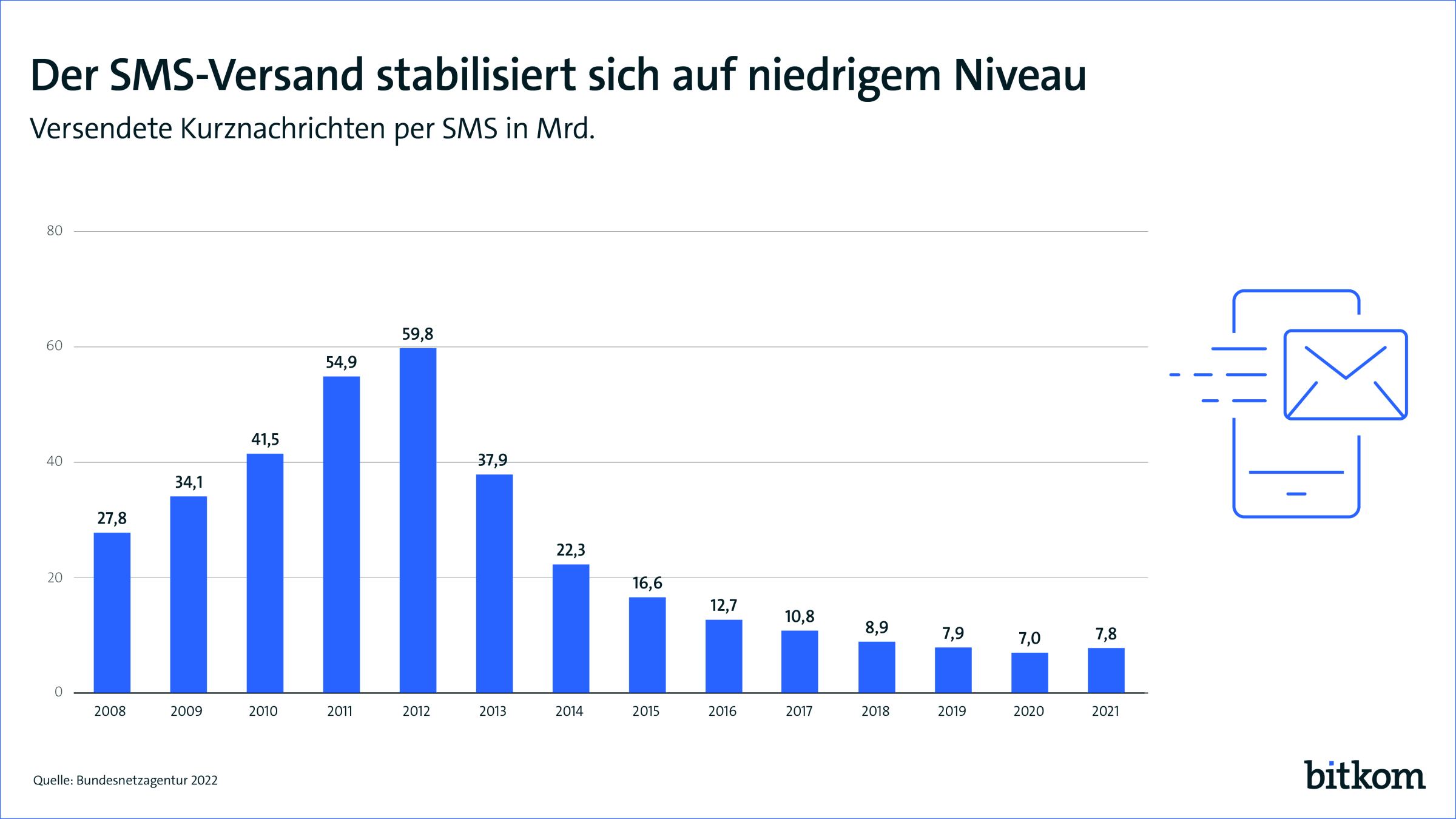 Berlin, 1. Dezember 2022 - Herzlichen Glückwunsch, SMS! 30 Jahre nach ihrer Einführung werden noch immer solche Text-Nachrichten verschickt. Zwar längst nicht mehr so viele wie früher – aber immer noch genug, damit der 160-Zeichen-Dienst wichtig bleibt. Wurden im Rekordjahr 2012 noch 59,8 Milliarden Kurzmitteilungen verschickt, sank die Zahl im Jahr 2020 auf ein Tief von 7,0 Milliarden. 2021 waren es wieder 7,8 Milliarden Kurznachrichten. Das teilt der Digitalverband Bitkom auf Basis von Daten der Bundesnetzagentur mit. „Die SMS bleibt auch nach ihrem All-Time-High im Jahr 2012 wichtig. Nicht nur für Menschen, die kein Smartphone besitzen, sondern insbesondere bei Authentifizierungsverfahren, zum Beispiel bei Bezahldiensten“, sagt Bitkom-Hauptgeschäftsführer Dr. Bernhard Rohleder. „Der SMS-Standard hat den Vorteil, dass er auf jedem Handy funktioniert und keine Internetverbindung oder gesonderte Anmeldung voraussetzt. Die meisten Mobilfunk-Tarife beinhalten überdies in der Regel eine SMS-Flat, so dass keine zusätzlichen Kosten entstehen.“