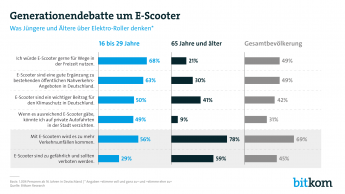 Besonders bei den Jüngeren zwischen 16 und 29 Jahren genießen E-Scooter aber weiterhin einen guten Ruf. Zwei Drittel (68 Prozent) würden E-Scooter gerne für Fahrten in der Freizeit nutzen, 61 Prozent für den Weg zur Arbeit oder Ausbildung. In der Gesamtbevölkerung sind es nur 49 bzw. 34 Prozent. Und fast jeder zweite 16- bis 29-Jährige (49 Prozent) ist sich sicher, dass er auf private Autofahrten verzichten könnte, wenn es genügend E-Scooter gäbe. Auch hier liegt die Zustimmung deutlich höher als in der Gesamtbevölkerung (31 Prozent).