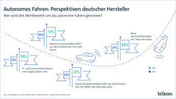 Grundlage der Angaben ist eine Umfrage, die Bitkom Research durchgeführt hat. Dabei wurden 1.005 Personen ab 16 Jahren in Deutschland telefonisch befragt. Die Umfrage ist repräsentativ. Die Fragestellung lautete: „Wer wird den Wettbewerb um das autonome Fahren gewinnen?“