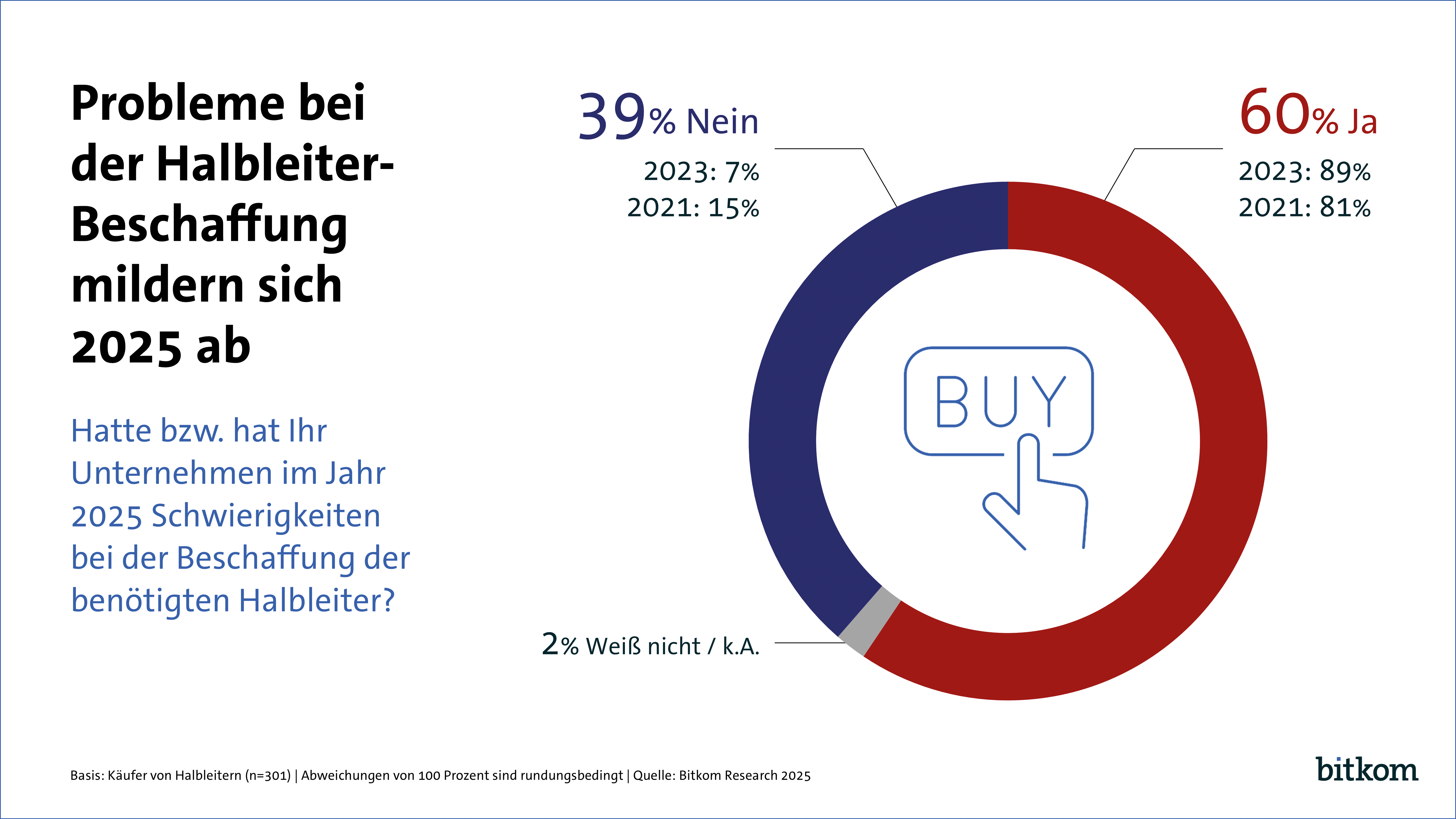 Grundlage der Angaben ist eine Umfrage, die Bitkom Research im Auftrag des Digitalverband Bitkom durchgeführt hat. Dabei wurden 503 Unternehmen aus verarbeitendem Gewerbe und ITK-Dienstleistungen ab 20 Beschäftigten in Deutschland telefonisch befragt, darunter 457 Unternehmen, die Halbleiter verwenden. Die Befragung fand im Zeitraum von KW 30 bis KW 36 2025 statt. Die Gesamtumfrage ist repräsentativ.