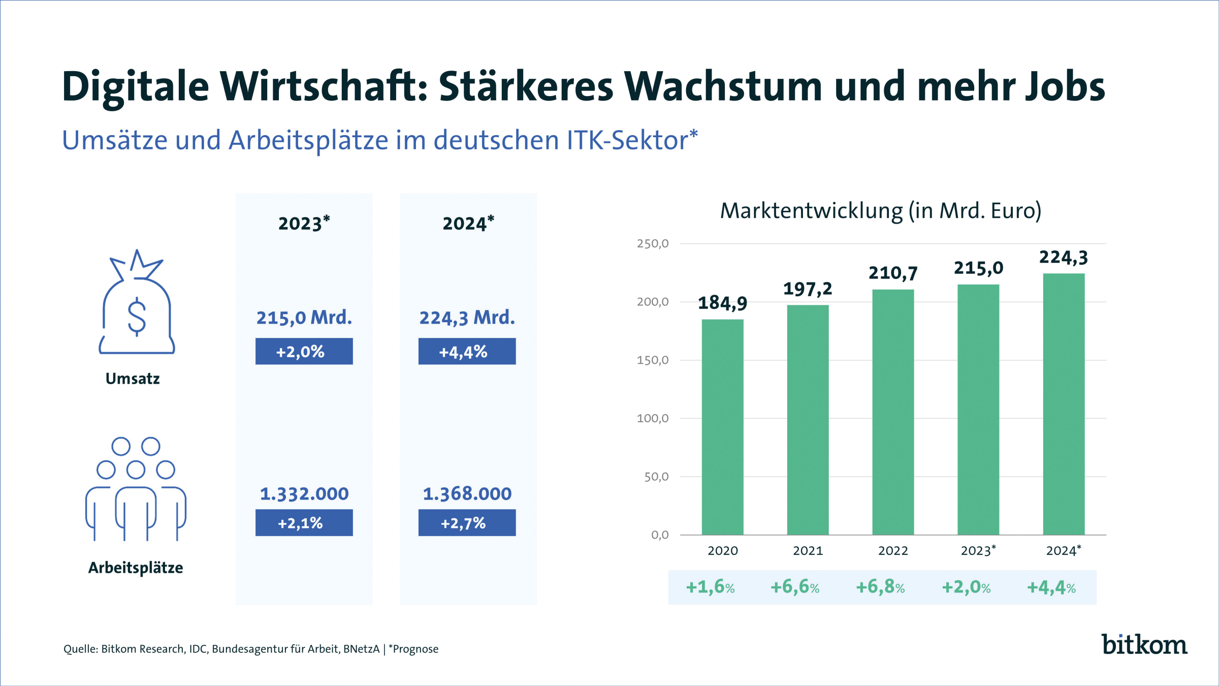 Berlin, 10. Januar 2024 - Deutschlands digitale Wirtschaft ist auf Wachstumskurs. Trotz eines schwierigen konjunkturellen Umfelds erwartet der Digitalverband Bitkom für die Unternehmen der IT und Telekommunikation (ITK) für 2024 ein Umsatzplus von 4,4 Prozent auf 224,3 Milliarden Euro. Der ITK-Sektor würde damit um den Faktor drei bis vier stärker wachsen als die Wirtschaft insgesamt. Im vergangenen Jahr hatten die ITK-Umsätze um 2,0 Prozent auf 215 Milliarden Euro zugelegt. Das Umsatzwachstum hat auch positive Auswirkungen auf den Arbeitsmarkt. Die Zahl der Beschäftigten in der ITK-Branche soll laut Bitkom im Jahresverlauf 2024 um 36.000 wachsen, auf 1,368 Millionen. Bereits 2023 sind 28.000 neue Arbeitsplätze entstanden. „Die meisten Unternehmen der Bitkom-Branche präsentieren sich krisenfest. Auch unter schwierigen konjunkturellen Bedingungen, geprägt von geopolitischen Krisen und Haushaltskürzungen, legen Umsätze und Beschäftigung zu. Insbesondere das Arbeitsplatzwachstum könnte noch deutlich größer ausfallen, der Fachkräftemangel erweist sich hier als Hemmschuh“, sagt Bitkom-Präsident Dr. Ralf Wintergerst. „Digitalisierung ist die Antwort auf die aktuellen Herausforderungen für Wirtschaft, Gesellschaft und Staat. Unser Vorsatz für 2024 muss lauten: Mehr Entschlossenheit bei der Digitalisierung und mehr Freiraum für Innovationen.“