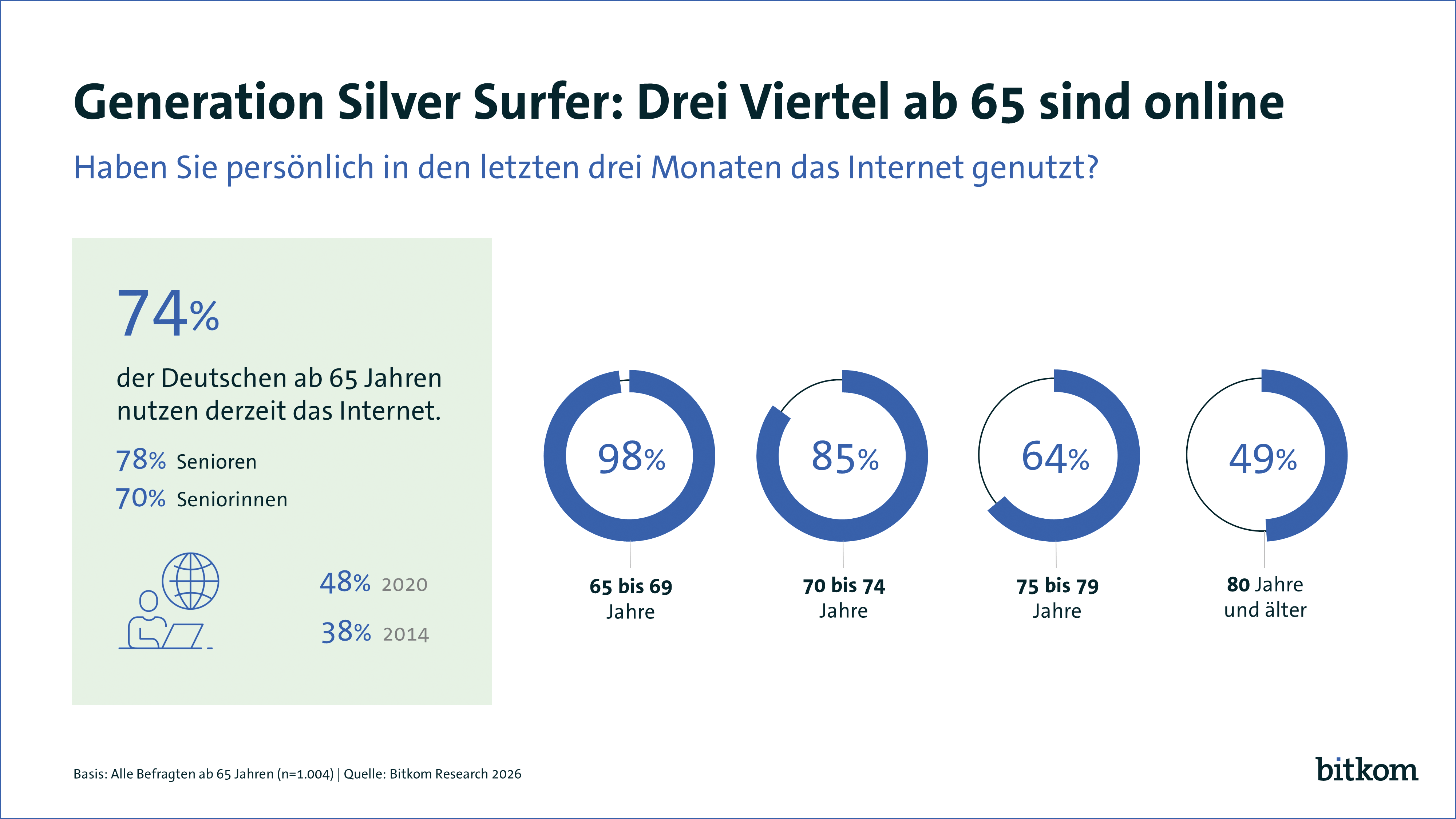 Berlin, 15. Januar 2026 – Immer mehr Seniorinnen und Senioren sind online. Sie sind weit überwiegend aufgeschlossen gegenüber neuen digitalen Technologien, fordern sogar mehr Tempo bei der Digitalisierung. Gleichzeitig schätzen sie die eigene Digitalkompetenz nur als mittelmäßig ein. Fast alle wünschen sich Unterstützungsangebote, um digitale Fähigkeiten zu erlernen und auszubauen. Das sind Ergebnisse einer Studie im Auftrag des Digitalverbands Bitkom, für die 1.004 Personen ab 65 Jahren in Deutschland repräsentativ befragt wurden. Während vor fünf Jahren erst knapp die Hälfte (48 Prozent) der Seniorinnen und Senioren in Deutschland online waren, nutzen inzwischen rund drei Viertel (74 Prozent) der Deutschen ab 65 Jahren das Internet. Senioren (78 Prozent) sind eher online als Seniorinnen (70 Prozent).