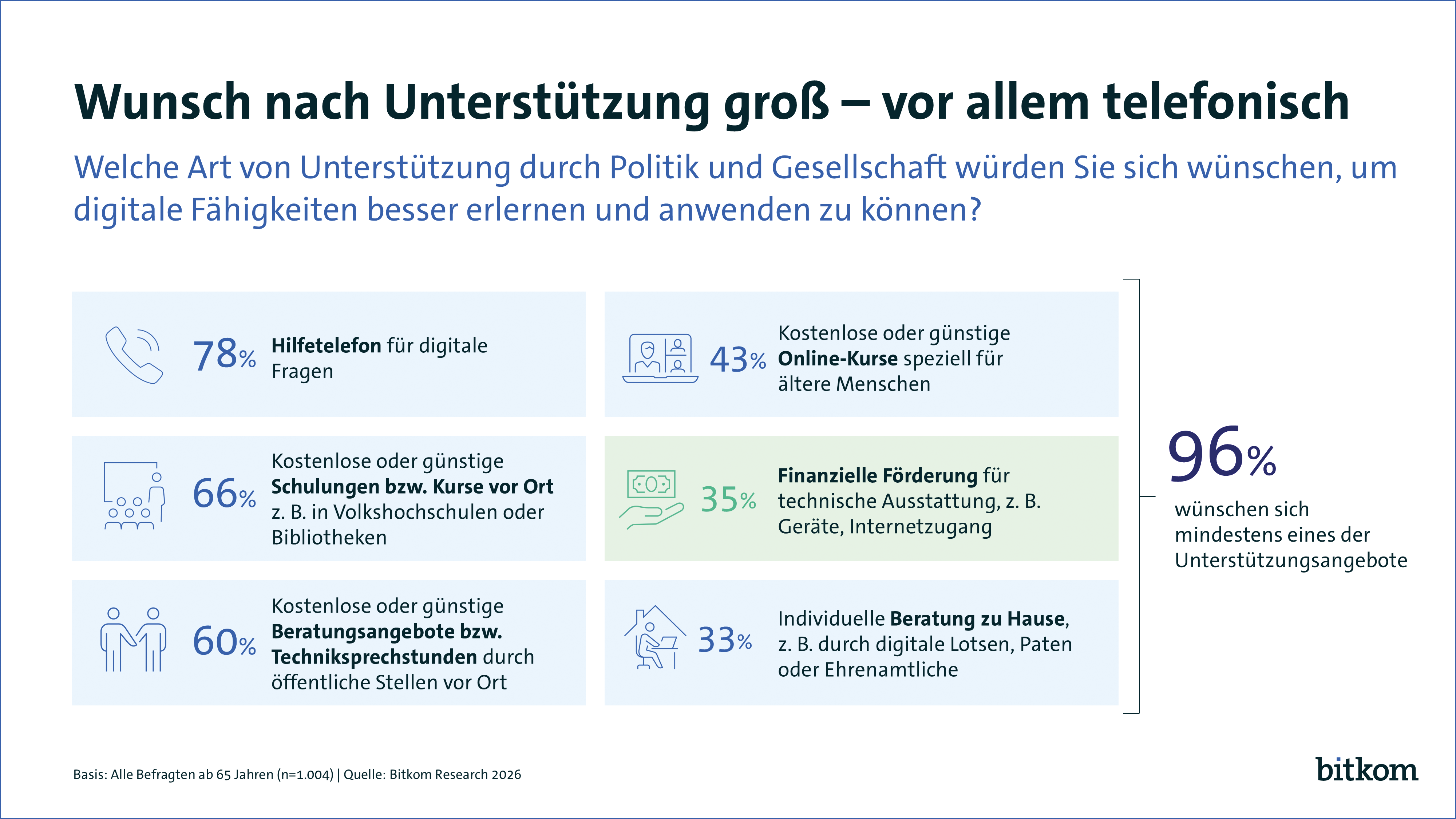 Die große Neugierde und Offenheit für Digitales kommen mit einem ebenso großen Wunsch nach Unterstützung: Generell finden 91 Prozent, der Staat sollte mehr dafür tun, dass niemand bei der Digitalisierung abgehängt wird. Fast alle (96 Prozent) wünschen sich ein Unterstützungsangebot, um digitale Fähigkeiten besser erlernen und anwenden zu können: Konkret wünschen sich 78 Prozent der Menschen über 65 ein Hilfetelefon für digitale Fragen. 66 Prozent wünschen sich kostenlose oder günstige Schulungen bzw. Kurse vor Ort, zum Beispiel in Volkshochschulen oder Bibliotheken, 60 Prozent kostenlose oder günstige Beratungsangebote bzw. Techniksprechstunden durch öffentliche Stellen vor Ort. Kostenlose oder günstige Online-Kurse speziell für ältere Menschen wünschen sich 43 Prozent, um ihre Digitalkompetenzen zu stärken. Ein Drittel (33 Prozent) wünscht sich individuelle Beratung zu Hause, zum Beispiel durch digitale Lotsen, Paten oder Ehrenamtliche. 35 Prozent wünschen sich eine finanzielle Förderung für ihre technische Ausstattung.