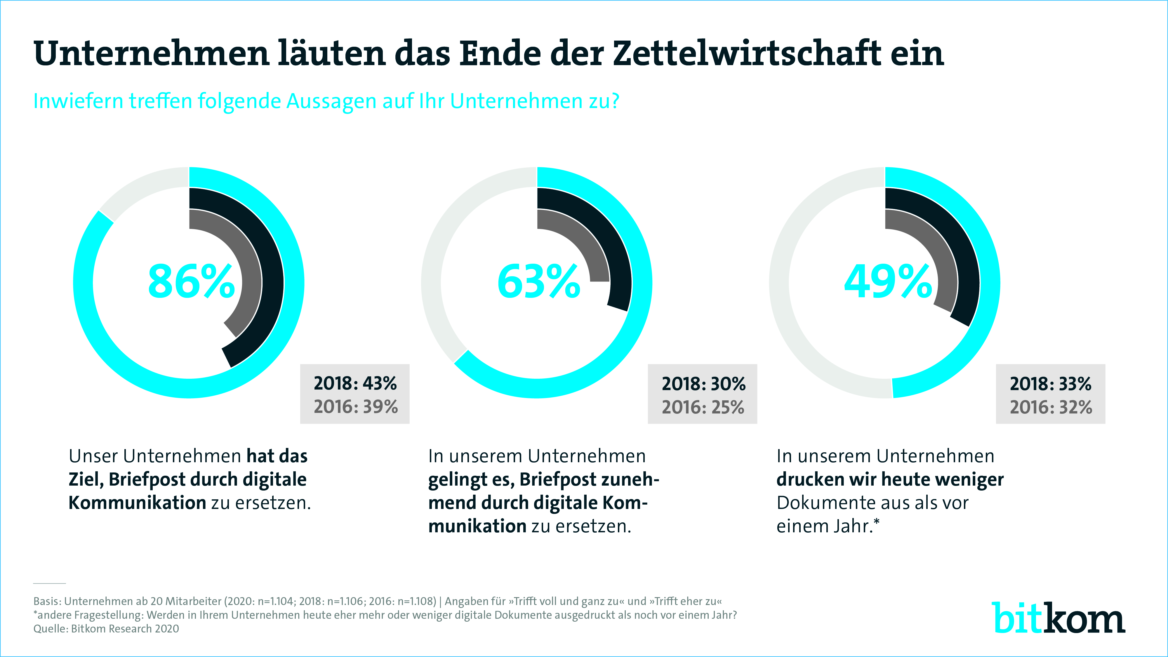 Berlin, 14. Oktober 2020 - Papierstapel, Briefe und Aktenordner haben ausgedient: Die deutsche Wirtschaft macht bei der Digitalisierung ihrer Verwaltungsprozesse in diesem Jahr kräftig Druck. So sagen fast 9 von 10 Geschäftsführern und Vorständen in Deutschland (86 Prozent), ihr Unternehmen habe das Ziel, Briefpost durch digitale Kommunikation zu ersetzen. Das ist doppelt so viel wie 2018, als es noch 43 Prozent waren. Fast zwei Drittel der Unternehmen (63 Prozent) gelingt dies bereits zunehmend – ebenfalls ein deutlicher Anstieg gegenüber 2018 (30 Prozent). Das sind die Ergebnisse einer repräsentativen Befragung unter 1.104 Unternehmen aller Branchen ab 20 Mitarbeitern in Deutschland, die im Auftrag des Digitalverbands Bitkom im Mai und Juni 2020 durchgeführt wurde. „Das Digital Office setzt sich in der deutschen Wirtschaft durch und ist in den vergangenen Monaten zum Inbegriff für Arbeitsfähigkeit und Zusammenarbeit in Unternehmen geworden. Je digitaler die Unternehmen aufgestellt und je etablierter digitale Prozesse sind, desto besser kommen sie durch diese herausfordernde Zeit“, sagt Peter Collenbusch, Vorsitzender der Kompetenzbereichs Digital Office im Bitkom. „Die Geschäftsprozesse der Zukunft laufen ausschließlich digital. Viele Unternehmen haben in den letzten Jahren bereits entscheidende Weichen gestellt. Die Corona-Pandemie hat dem Digital Office einen weiteren Boost verliehen.“
