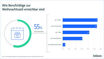 Berlin, 19. Dezember 2022 - Entspannt das Jahr ausklingen lassen: Diese Devise gilt für die Hälfte der Berufstätigen nur eingeschränkt. 55 Prozent bleiben auch im Weihnachtsurlaub dienstlich erreichbar. Das ist das Ergebnis einer repräsentativen Befragung unter 1.005 Menschen in Deutschland, darunter 517 Berufstätige. Praktisch alle, die im Weihnachtsurlaub erreichbar sind, gehen dienstlich ans Telefon (55 Prozent), fast ebenso viele (54 Prozent) sind auch per Kurznachricht erreichbar. Per E-Mail lassen sich 42 Prozent in den Ferien kontaktieren und 31 Prozent per Videocall. Nur eine Minderheit von 4 Prozent ist mit Chatnachrichten über Kollaborationstools wie Slack oder Microsoft Teams dienstlich in den Weihnachtsferien zu erreichen. Insgesamt bewegt sich die Tendenz zur Erreichbarkeit im Weihnachtsurlaub auf dem gleichen Niveau wie 2021, als 53 Prozent der Berufstätigen erreichbar waren. Im Vor-Corona-Jahr 2019 waren es allerdings noch 71 Prozent. „Die Grenzen zwischen Berufs- und Privatleben verschwimmen in einigen Jobs stark. Damit das Wohlbefinden der Beschäftigten nicht leidet, sollten Arbeitgeber während der Urlaubszeiten funktionierende Vertretungslösungen organisieren und klare Regeln zur Erreichbarkeit kommunizieren“, sagt Bitkom-Hauptgeschäftsführer Dr. Bernhard Rohleder.