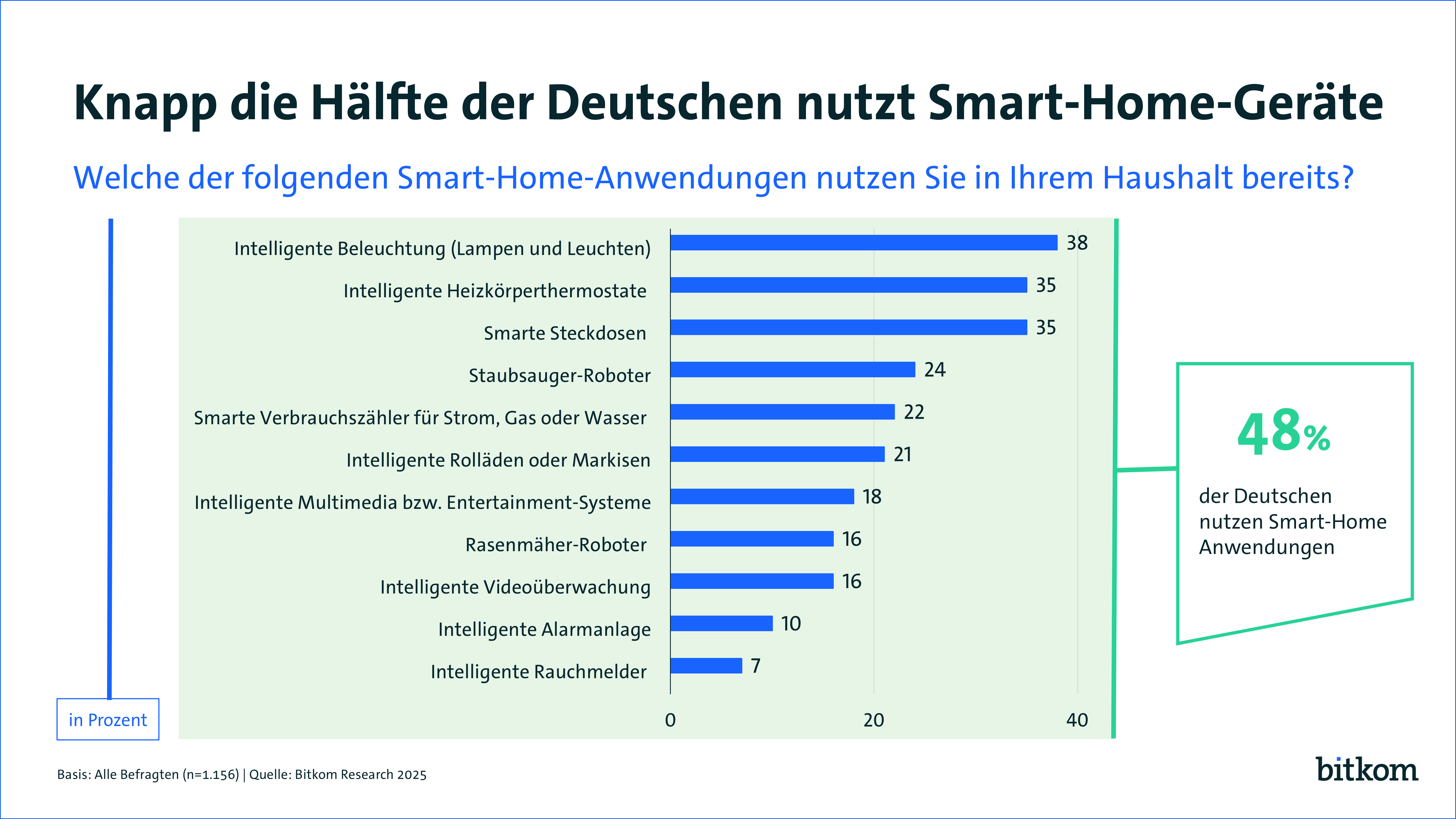 Grundlage der Angaben ist eine Umfrage, die Bitkom Research im Auftrag des Digitalverbands Bitkom durchgeführt hat. Dabei wurden 1.156 Personen in Deutschland ab 16 Jahren telefonisch befragt. Die Befragung fand im Zeitraum KW 39 bis KW 43 2025 statt. Die Umfrage ist repräsentativ. Die Fragen lauteten: „Welche der folgenden Smart-Home-Anwendungen nutzen Sie in Ihrem Haushalt bereits?“ und „Wie viele verschiedene Smart-Home-Anwendungen nutzen Sie?“.