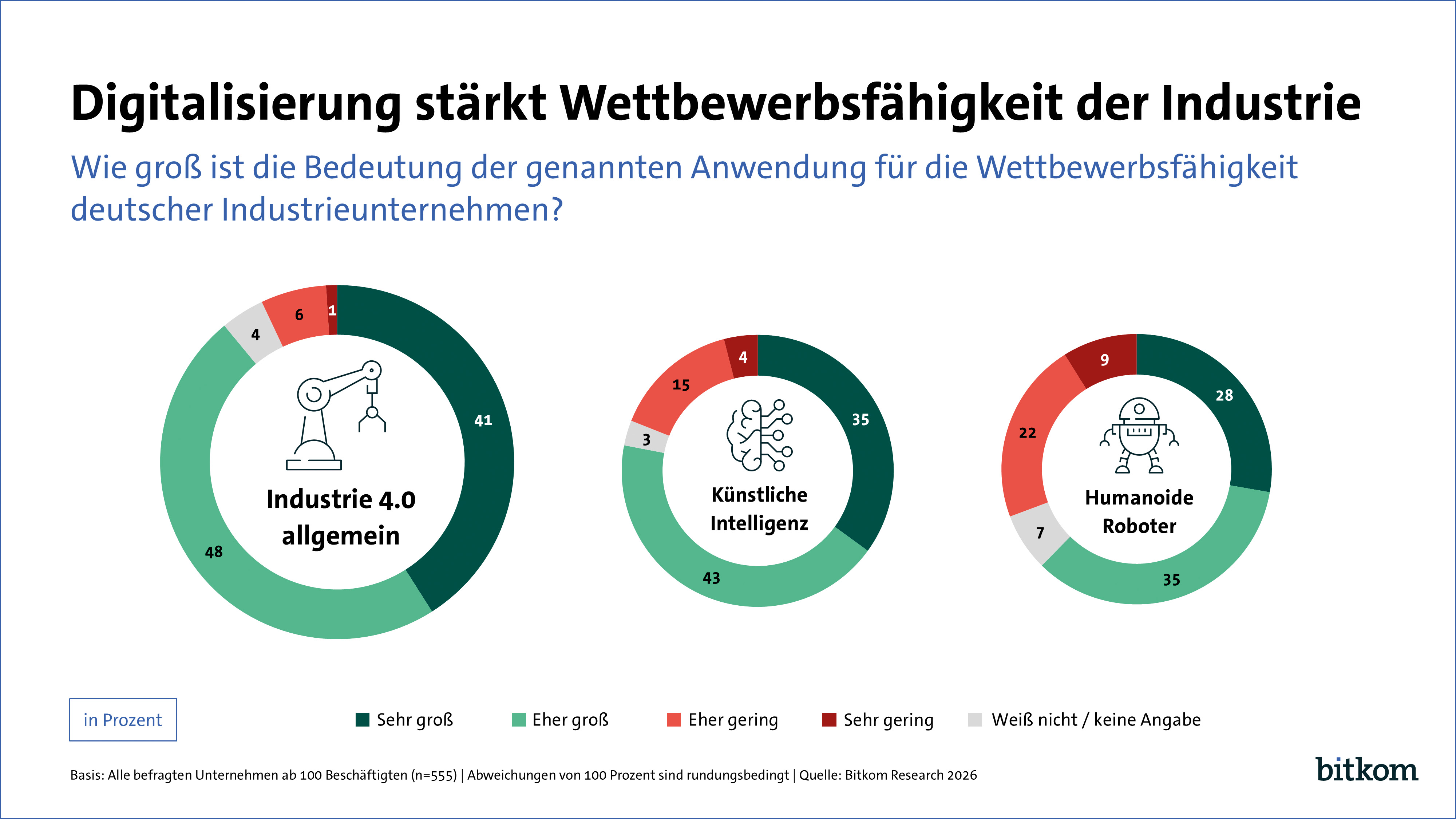 Grundlage der Angaben ist eine Umfrage, die Bitkom Research im Auftrag des Digitalverbands Bitkom durchgeführt hat. Dabei wurden 555 Industrieunternehmen des verarbeitenden Gewerbes ab 100 Beschäftigten in Deutschland telefonisch befragt. Die Umfrage ist repräsentativ. Die Befragung fand im Zeitraum von KW 6 2026 bis KW 11 2026 statt.
