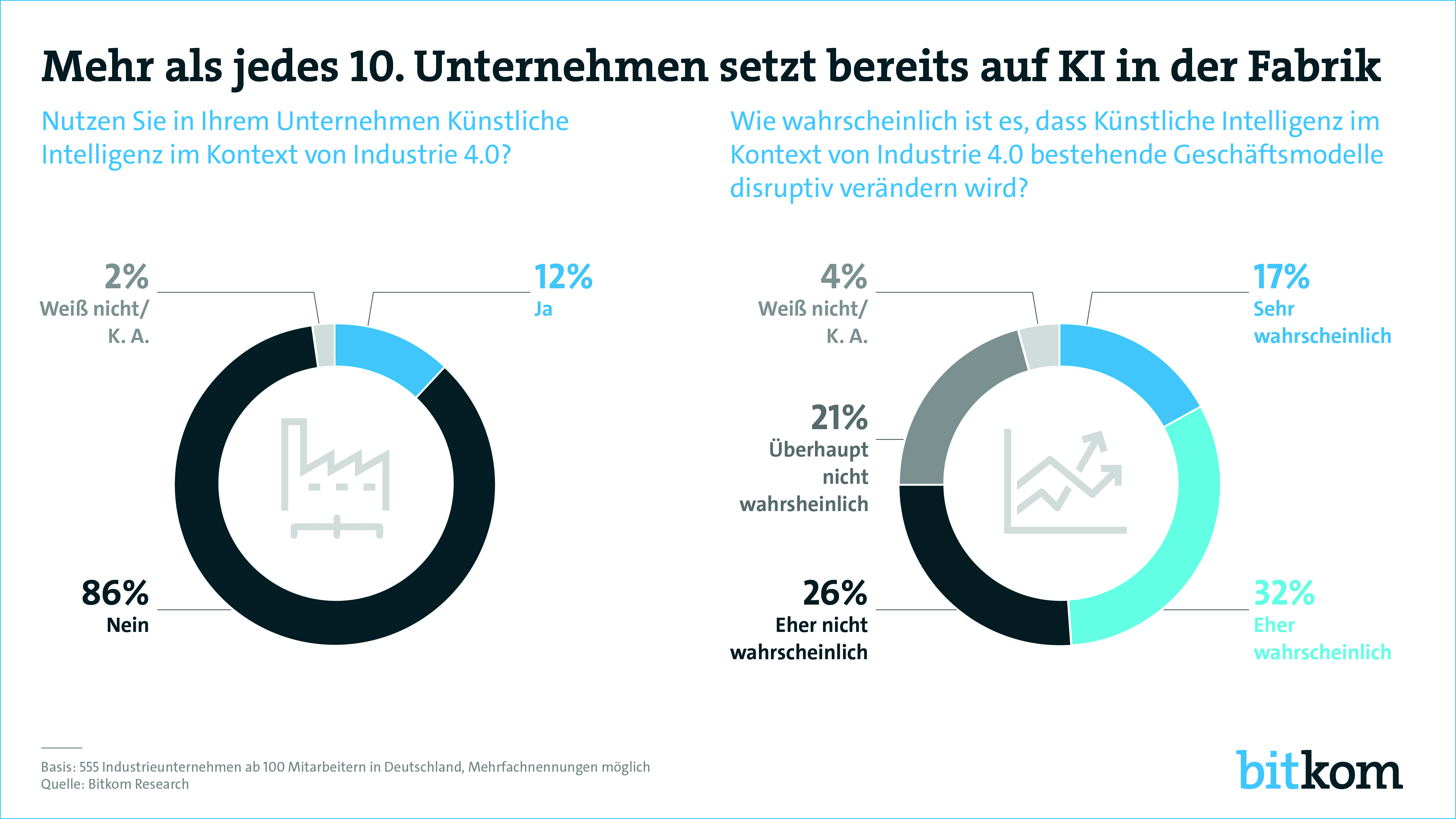 Berlin, 1. April 2019 – Künstliche Intelligenz rückt in den Fokus smarter Fabriken. Ob Roboter, die Aufgaben eigenständig erfüllen und ihr Wissen an andere Maschinen weitergeben, oder KI-Systeme, die Techniker bei Reparaturen anleiten: 12 Prozent der deutschen Industrieunternehmen nutzen heute bereits Künstliche Intelligenz im Kontext von Industrie 4.0. Das ergibt eine repräsentative Befragung in der deutschen Industrie im Auftrag des Digitalverbands Bitkom. Dafür wurden im Vorfeld der Hannover Messe 555 Industrieunternehmen ab 100 Mitarbeitern befragt. „Künstliche Intelligenz erobert die Fabriken im Eiltempo und ist die Basis für kontinuierliche Verbesserungen in der Fertigung. KI hat das Potenzial, die Industrie zu revolutionieren“, sagt Bitkom-Präsident Achim Berg. Dank maschinellem Lernen ließen sich Daten unterschiedlicher Quellen miteinander verknüpfen, Fehler vorhersehen und Probleme beheben. „Mit der KI-Branche und der Fertigungsindustrie kommen in Deutschland zwei starke Player zusammen, um gemeinsam weltweit die Spitze zu erobern.“