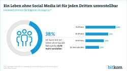 Berlin, 27. Februar 2018 - Private und berufliche Kontakte pflegen, Fotos teilen, Live-Videos senden: Mehr als jeder Dritte (38 Prozent) kann sich ein Leben ohne Social Media nicht mehr vorstellen. Unter den 14- bis 29-Jährigen ist es sogar jeder Zweite (49 Prozent). Das geht aus einer repräsentativen Umfrage unter 1.212 Internetnutzern ab 14 Jahren im Auftrag des Digitalverbands Bitkom hervor, die heute in Berlin vorgestellt wurde. Fast 9 von 10 Internetnutzern (87 Prozent) sind inzwischen in sozialen Netzwerken angemeldet. Besonders von den 14- bis 29 Jährigen ist nahezu jeder dabei (98 Prozent). Ähnlich sieht die Situation bei den 30- bis 49-Jährigen aus (92 Prozent). Von den 50- bis 64-Jährigen sind 80 Prozent in mindestens einem sozialen Netzwerk angemeldet, aber auch bei den Älteren über 65 Jahre ist es mit 65 Prozent eine deutliche Mehrheit. „Social Media ist schon lange kein Jugend- oder Nischenphänomen mehr, sondern hat sich innerhalb weniger Jahre zu einem festen Teil unseres Lebens entwickelt“, sagte Bitkom-Hauptgeschäftsführer Dr. Bernhard Rohleder. „Heute gehört es für viele Internetnutzer in der digitalen Welt einfach dazu, über ein eigenes Social-Media-Profil im Web präsent und erreichbar zu sein. Social Media hat in vielen Bereichen klassische Online-Funktionen ergänzt und ersetzt.“ Im Schnitt sind Internetnutzer in Deutschland in drei sozialen Netzwerken angemeldet. Die Jüngeren zwischen 14- bis 29 Jahren sind deutlich aktiver und haben durchschnittlich fünf Social-Media-Auftritte.