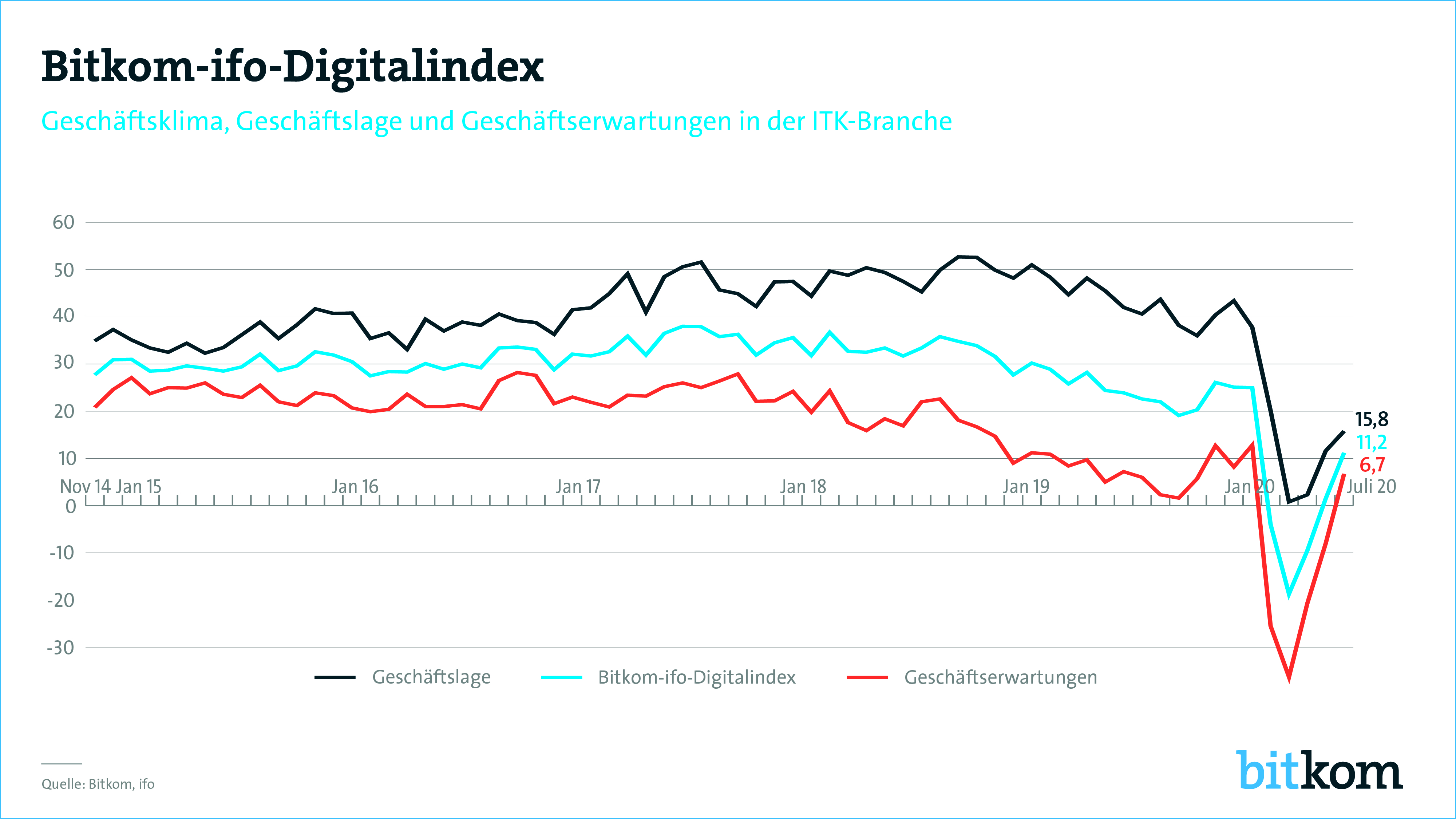 Berlin, 03. August 2020 - In der Digitalbranche hat sich im Juli die konjunkturelle Erholung nach dem tiefen Einbruch durch die Corona-Krise fortgesetzt. Der Index für die aktuelle Geschäftslage legte um 4,7 Zähler auf 15,8 Punkte zu. Noch stärker sind die Geschäftserwartungen gestiegen, um 14,4 Zähler auf 6,7 Punkte. Damit notieren die Geschäftsaussichten der Digitalunternehmen für das kommende halbe Jahr erstmals seit dem Beginn der Corona-bedingten Einschränkungen wieder im positiven Bereich. Insgesamt konnte sich der Bitkom-ifo-Digitalindex, der sich aus der Einschätzung von Geschäftslage und Geschäftserwartung berechnet, weiter deutlich erholen und stieg den dritten Monat in Folge. Er notiert nun mit einem Plus von 9,7 Zählern bei 11,2 Punkten. Verglichen mit der letzten Erhebung vor der Corona-Krise ist dies allerdings immer noch mehr als eine Halbierung – im Februar notierte der Bitkom-ifo-Digitalindex noch bei 25 Punkten. Die Konjunktur der Digitalbranche entwickelt sich damit deutlich besser als die der Gesamtwirtschaft. Das ifo-Geschäftsklima für Juli liegt mit -2,1 Punkten weiterhin im negativen Bereich. „Die Corona-Krise hat die Digitalbranche hart getroffen. Wenn es jetzt langsam wieder aufwärts geht, darf das nicht darüber hinwegtäuschen: Es wird noch Monate dauern, bis wir die Corona-Krise konjunkturell überwunden haben“, sagt Bitkom-Präsident Achim Berg. „Wir sollten jetzt alles daran setzen, unsere Wirtschaft, unsere Schulen, unser Gesundheitssystem und unsere Verwaltung konsequent zu digitalisieren, um sie robuster gegen solche globalen Krisen zu machen.“ Angesichts wieder steigender Infektionszahlen mahnt er: „Der verständliche Wunsch nach Normalität darf nicht dazu führen, dass wir das durch die Opfer der letzten Monate Erreichte leichtsinnig aufs Spiel setzen.“