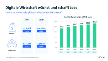 Berlin, 09. Januar 2025 – Deutschland steuert auf das dritte Rezessionsjahr zu – die digitale Wirtschaft bleibt aber auf Wachstumskurs. Trotz des aktuell schwierigen konjunkturellen Umfelds erwartet der Digitalverband Bitkom im deutschen Markt für IT und Telekommunikation (ITK) 2025 ein Umsatzplus von 4,6 Prozent auf 232,8 Milliarden Euro. Im vergangenen Jahr hatten die ITK-Umsätze um 3,3 Prozent auf 222,6 Milliarden Euro zugelegt. Parallel entstehen in der Branche neue Arbeitsplätze. Die Zahl der Beschäftigten im ITK-Sektor soll laut Bitkom im Jahresverlauf 2025 um rund 20.000 auf 1,371 Millionen wachsen. Im Jahr 2024 sind 9.000 neue Arbeitsplätze entstanden. „Die Digitalwirtschaft bietet einen Lichtblick in schwierigen Zeiten, steigert den Umsatz und schafft neue Jobs. Mittlerweile ist die ITK-Branche Deutschlands größter industrieller Arbeitgeber. Die Geschäfte der meisten Unternehmen der IT- und Telekommunikationsbranche verlaufen den Prognosen zufolge 2025 positiv. Die Richtung in der IT stimmt.“, sagt Bitkom-Präsident Dr. Ralf Wintergerst. „Die Politik sollte alles tun, um das Wachstumstempo zu verstärken.“