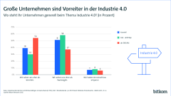 Immerhin 39 Prozent der deutschen Industrieunternehmen sehen sich als Vorreiter der Industrie 4.0. Andererseits gruppiert sich jedes Zweite (51 Prozent) als Nachzügler. 7 Prozent der Unternehmen fühlen sich abgehängt. Den größten Nachholbedarf hat der Mittelstand. So bezeichnen sich 58 Prozent der Unternehmen mit 100 bis 499 Beschäftigten als Nachzügler und nur 30 Prozent als Vorreiter. Unter den großen Unternehmen ab 500 Mitarbeitenden ist es umgekehrt: Lediglich 37 Prozent sehen sich als Nachzügler, mehr als die Hälfte (54 Prozent) als Vorreiter.