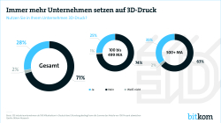 Hinweis zur Methodik: Grundlage der Angaben ist eine repräsentative Befragung, die Bitkom Research im Auftrag des Digitalverbands Bitkom durchgeführt hat. Dabei wurden 553 Produktionsleiter, Vorstände oder Geschäftsführer von Industrieunternehmen ab 100 Mitarbeitern in Deutschland telefonisch befragt. Die Fragestellungen lauteten: " Nutzen Sie in Ihrem Unternehmen 3D-Druck?", „Was sind aus Sicht Ihres Unternehmens die wichtigsten Vorteile von 3D-Druck?", „Wie wahrscheinlich ist es, dass 3D-Druck bestehende Geschäftsmodelle und/oder Wertschöpfungsketten disruptiv, d.h. tiefgreifend, verändern wird?", „Wie lange wird es Ihrer Meinung nach dauern, bis 3D-Druck Geschäftsmodelle und/oder Wertschöpfungsketten disruptiv verändern wird?“ und „Wofür wird 3D-Druck bereits konkret eingesetzt?“