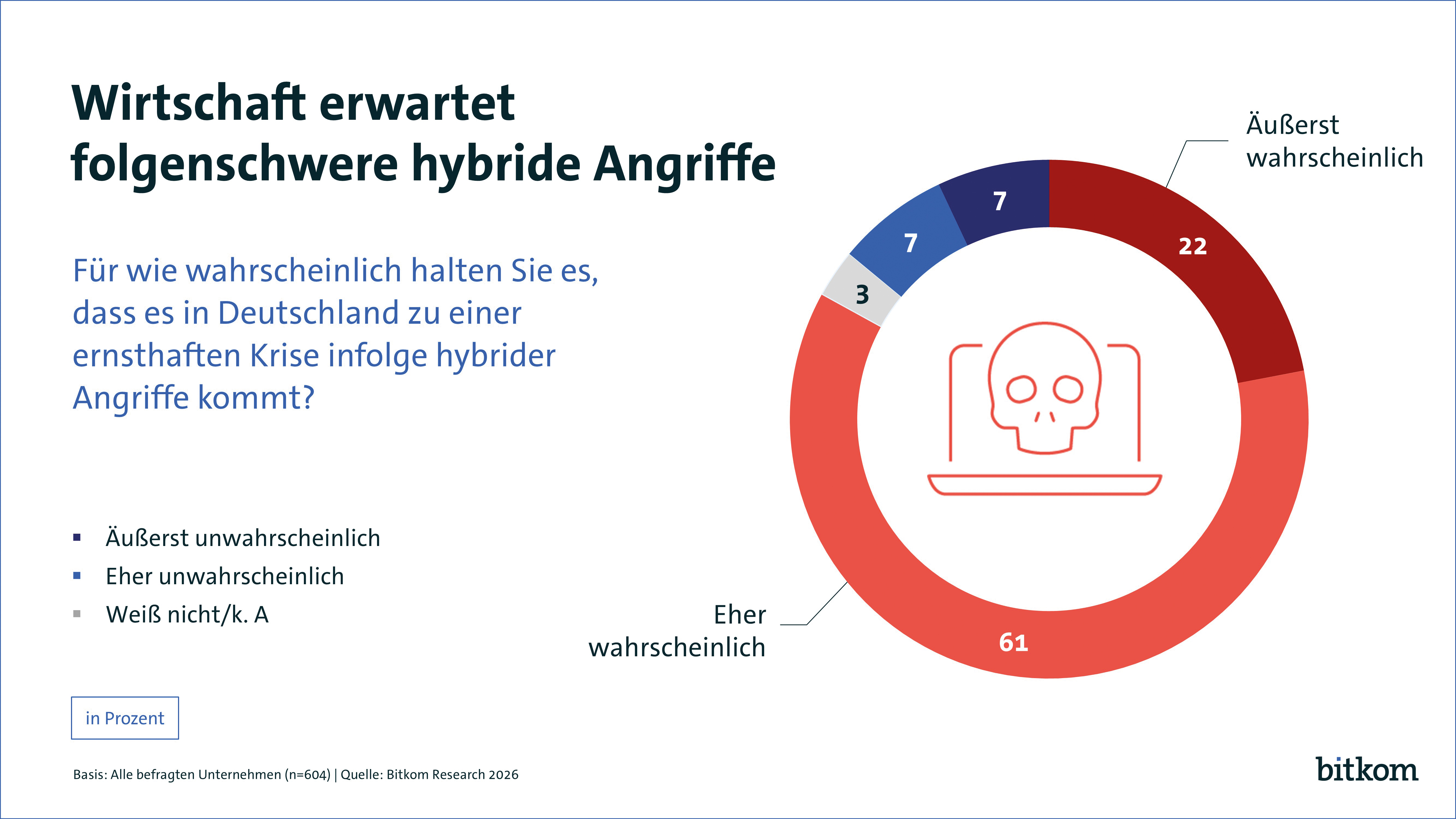 Berlin, 11. Februar 2026 - Stromausfall durch zerstörte Leitungen, gezielte Sabotage von Internetkabeln in der Ostsee oder mit Ransomware lahmgelegte Fabriken: Deutschland ist Ziel von digitalen und klassischen Angriffen, zugleich ist die deutsche Wirtschaft schlecht auf solche hybriden Bedrohungen vorbereitet. Bei einem Internetausfall könnten Unternehmen im Schnitt ihren Geschäftsbetrieb nur 20 Stunden aufrechterhalten, jedes fünfte (21 Prozent) müsste sogar sofort die Arbeit einstellen. Umgekehrt sind nur 8 Prozent sicher, länger als 48 Stunden weiterarbeiten zu können. Zugleich rechnen drei Viertel der Unternehmen (74 Prozent) wegen der zunehmenden Spannungen zwischen Russland und der NATO mit einer erhöhten Gefahr hybrider Angriffe, 8 von 10 (83 Prozent) erwarten eine ernsthafte Krise in Deutschland in Folge von hybriden Angriffen. Und 53 Prozent gehen sogar von einer militärischen Konfrontation zwischen Russland und der NATO in den kommenden fünf Jahren aus. Das sind Ergebnisse einer Befragung von 604 Unternehmen ab 10 Beschäftigten in Deutschland im Auftrag des Digitalverbands Bitkom, die heute im Vorfeld der Münchener Sicherheitskonferenz und der Munich Cyber Security Conference vorgestellt wurde. „Anfang Januar mussten nach einem Anschlag mehr als 100.000 Menschen in Berlin bei Minustemperaturen tagelang ohne Strom auskommen, mehr als 2.000 Unternehmen waren betroffen. Hybride Angriffe auf Deutschland, die sich in einer Grauzone zwischen Krieg und Frieden abspielen, sind kein potenzielles Risiko, sie sind Realität. Deshalb müssen wir die Resilienz von Wirtschaft, Staat und Gesellschaft massiv hochfahren“, sagt Bitkom-Präsident Dr. Ralf Wintergerst. Aktuell sagen drei Viertel (73 Prozent) der Unternehmen, Deutschland sei im internationalen Vergleich unzureichend auf hybride Angriffe vorbereitet.