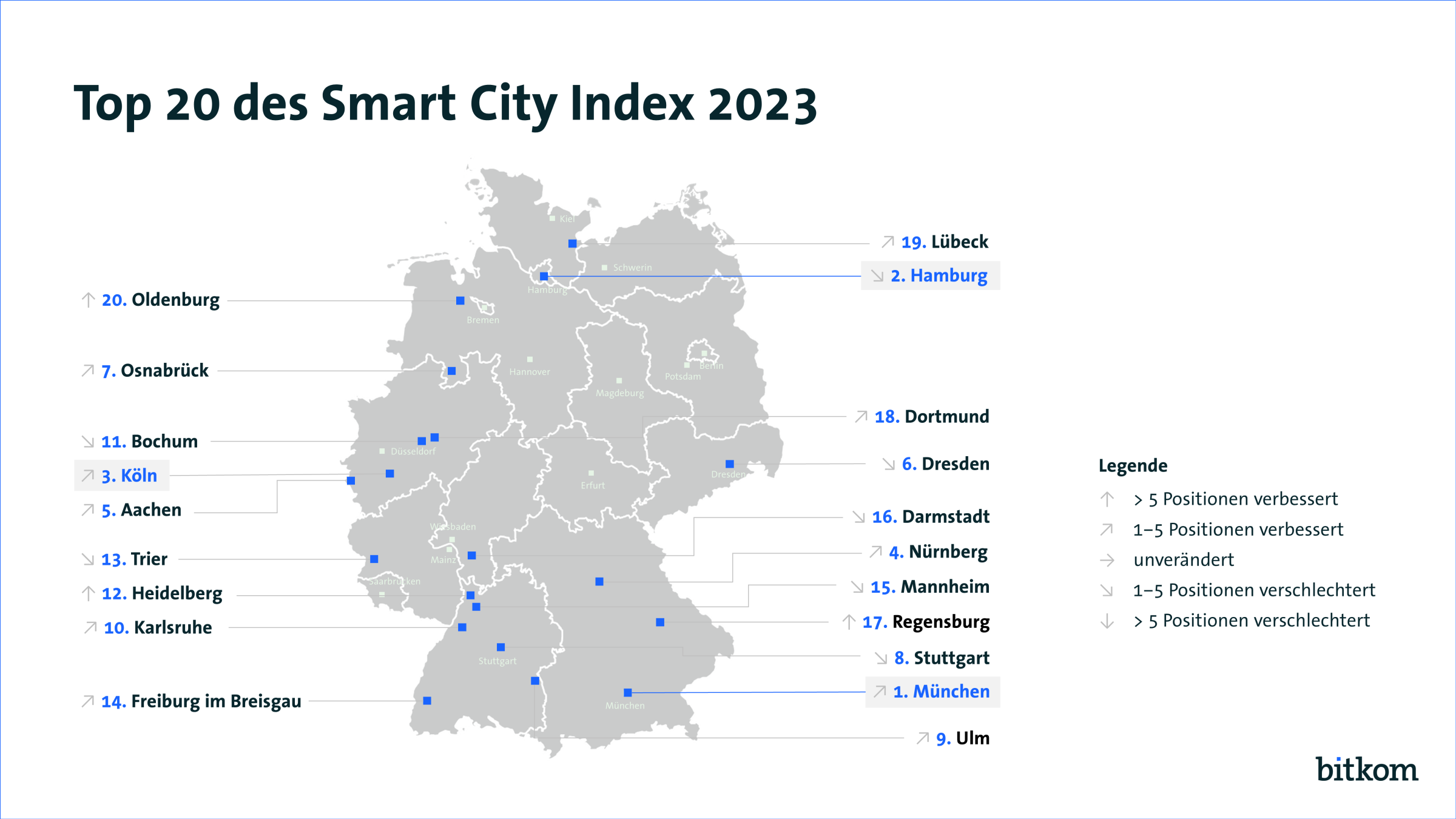 „Der fünfte Smart City Index zeigt genauer als je zuvor den Stand der Digitalisierung der deutschen Großstädte. Wir haben die untersuchten Indikatoren erweitert, zudem haben wir erstmals das wichtige Thema Bildung mit in den Blick genommen. Wir sehen eine große Dynamik innerhalb des Rankings und erstmals auch einen Wechsel an der Spitze: München kann sich knapp vor Hamburg setzen und erntet damit den Lohn der Anstrengungen der vergangenen Jahre“, sagt Bitkom-Präsident Dr. Ralf Wintergerst. „Unter den Top 10 finden sich aber nicht nur Metropolen wie München und Hamburg, sondern auch kleinere Universitätsstädte wie Aachen, Osnabrück oder Ulm. Das zeigt einmal mehr, dass man nicht groß sein muss, um smart sein zu können. Wichtig sind vielmehr ein professionelles Management der Digitalisierungs-Aktivitäten und ein gemeinsames Engagement von Politik, Unternehmen und Zivilgesellschaft vor Ort.“