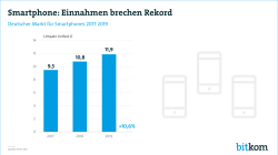 Berlin, 28. August 2019 - Der Umsatz mit Smartphones in Deutschland steht vor einem neuen Rekord. Laut einer Prognose des Digitalverbands Bitkom werden 2019 in Deutschland mit Smartphones 11,9 Milliarden Euro eingenommen, ein Plus von 11 Prozent gegenüber dem bisherigen Rekordjahr 2018. Die Anzahl der verkauften Geräte bleibt mit 22,4 Millionen Smartphones auf hohem Niveau stabil (2018: 22,6 Millionen). Es dominieren Smartphones ab einer Display-Größe von 5,5-Zoll den Markt – sogenannte Phablets. 18,4 Millionen verkaufte Geräte fallen in diese Kategorie. Dabei verschwimmen die Grenzen zwischen beruflicher und privater Nutzung gerade im hochpreisigen Segment zunehmend.