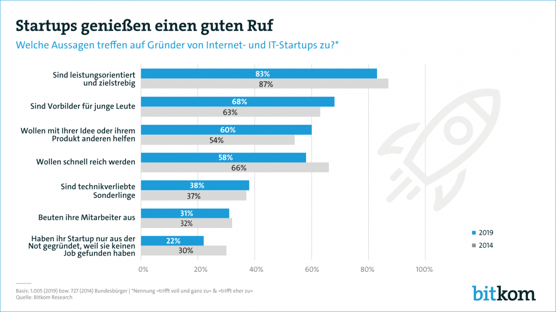 Berlin, 09. August 2019 - Startup-Gründer genießen in der Bevölkerung einen guten Ruf. Eine breite Mehrheit von 83 Prozent hält sie für leistungsorientiert und zielstrebig, zwei Drittel (68 Prozent) sehen in ihnen ein Vorbild für die junge Generation. Das ist das Ergebnis einer repräsentativen Befragung von 1.003 Bundesbürgern im Auftrag des Digitalverbands Bitkom. Vor fünf Jahren lag der Anteil bei 87 bzw. 63 Prozent. Bei den Motiven für die Gründung überwiegt anders als vor fünf Jahren inzwischen eine positive Einschätzung. So sagen 60 Prozent der Deutschen, die Gründer wollen mit ihrer Idee oder ihrem Produkt anderen helfen (2014: 54 Prozent). Nur 58 Prozent meinen, die Gründer wollen schnell reich werden (2014: 66 Prozent). „Startup-Gründer sind Unternehmer, die in der Regel ein hohes persönliches Risiko eingehen, um ihre Idee umzusetzen. Das positive Bild in der Bevölkerung ist erfreulich, es muss Ansporn sein, in allen Bereichen der Gesellschaft den Gründergeist zu wecken“, sagt Bitkom-Präsident Achim Berg. „Wenn Startup-Gründer für eine breite Mehrheit zum Vorbild werden, dann sollten wir diese Vorbilder in unsere Schulen und Universitäten holen. Wir müssen dafür sorgen, dass noch mehr junge Menschen den Schritt zum eigenen Startup wagen.“