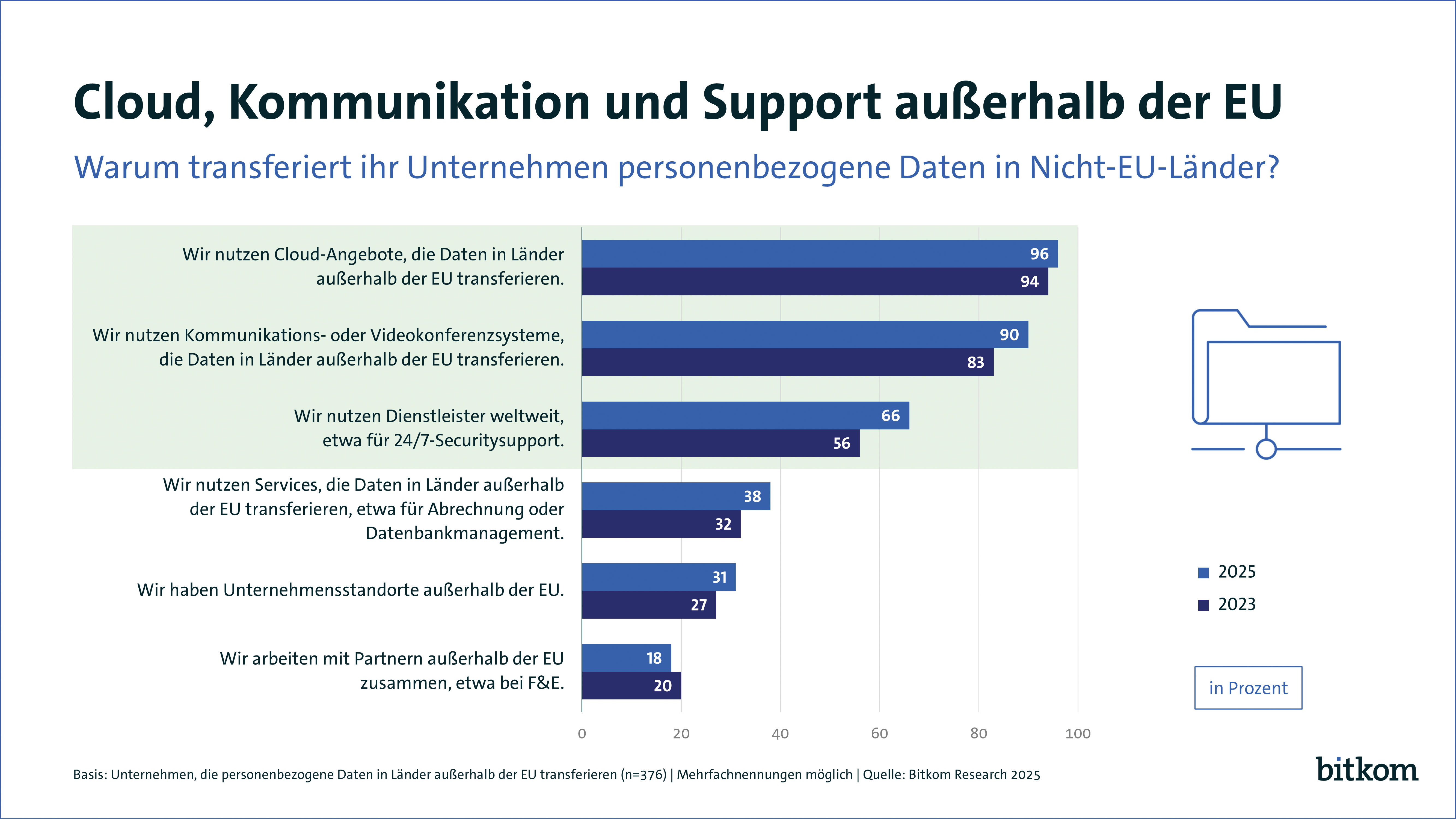 Fast alle Unternehmen, die personenbezogene Daten ins Nicht-EU-Ausland transferieren, tun dies, um auf Cloud-Angebote (96 Prozent) oder Kommunikations- und Videokonferenzsysteme (90 Prozent) zuzugreifen. Zwei Drittel (66 Prozent) nutzen weltweite Dienstleister, etwa für einen 24/7-Sicherheitssupport. Rund ein Drittel (38 Prozent) nutzen Services für Abrechnungen oder Datenbankmanagement, die Daten in Länder außerhalb der EU übertragen. 31 Prozent haben Unternehmensstandorte außerhalb der EU, 18 Prozent arbeiten mit Partnern außerhalb der EU zusammen, etwa bei Forschung und Entwicklung.