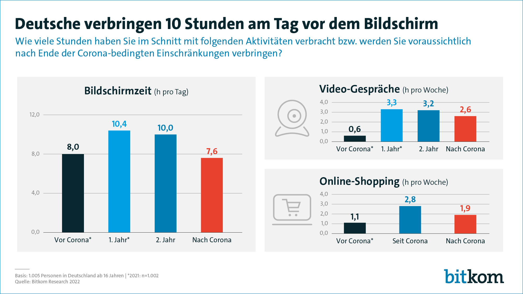 Berlin, 25. Januar 2022 - Ob Smartphone, Laptop oder Fernseher: Seit Corona verbringen die Menschen mehr Zeit vor dem Bildschirm. So beträgt die durchschnittliche Bildschirmzeit derzeit 10 Stunden pro Tag, 70 Stunden in der Woche. Dieser Wert ist seit Beginn der Pandemie vor zwei Jahren von damals 8 um 2 Stunden pro Tag gewachsen. Starke Anstiege verzeichnen vor allem Videostreaming, Videotelefonie und Online-Shopping. Knapp ein Viertel der zusätzlichen Bildschirmzeit, im Durchschnitt 24 Minuten pro Tag zusätzlich, werden Videos, Filme oder Serien gestreamt – insgesamt fast eine Stunde am Tag (57 Minuten). Videotelefonate gab es vor der Pandemie so gut wie gar nicht. Gerade einmal 5 Minuten täglich wurde privat per Video telefoniert, jetzt ist es fast eine halbe Stunde (27 Minuten). Auch die Zeit, die man mit Online-Shopping zubringt, hat sich mehr als verdoppelt. Für die Shopping-Tour im Web wird im Schnitt täglich eine Viertelstunde zusätzlich investiert, 24 Minuten sind es unter dem Strich jeden Tag. Das zeigt eine aktuelle repräsentative Befragung von mehr als 1.000 Personen ab 16 Jahren in Deutschland, die im Auftrag des Digitalverbands Bitkom durchgeführt wurde. „In der Corona-Pandemie haben digitale Technologien das Leben am Laufen gehalten, beruflich wie privat. Dabei wächst das Bedürfnis, wieder mehr Zeit in der analogen Welt zu verbringen“, sagt Bitkom-Präsident Achim Berg. So haben sich viele Menschen vorgenommen, ihre Bildschirmzeit nach Ende der Corona-bedingten Einschränkungen auf durchschnittlich 7,6 Stunden pro Tag zu reduzieren und damit unter das Vor-Krisen-Niveau zu bringen. Berg: „Wie auch immer die künftige Entwicklung sein wird: Mehr als jeder fünfte Haushalt (22 Prozent) hat sich auf eine anhaltend intensive Internetnutzung vorbereitet und wegen der Pandemie einen leistungsfähigeren Breitbandanschluss schalten lassen.“