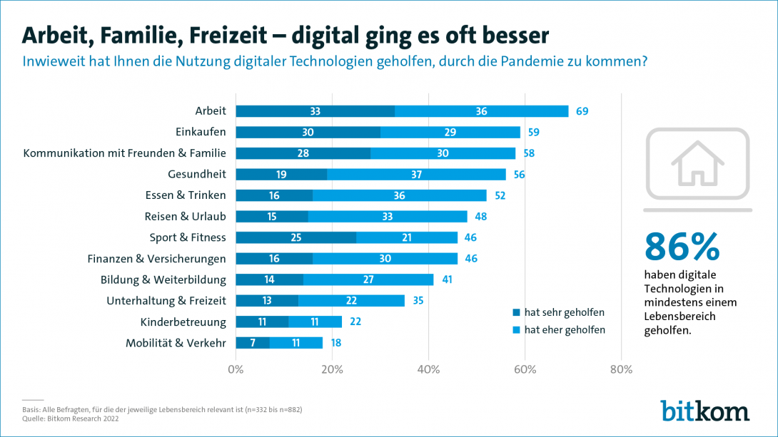 Eine große Mehrheit profitiert während der Pandemie von der Digitalisierung im Alltag. So helfen digitale Technologien 86 Prozent in mindestens einem für sie relevanten Lebensbereich. Ganz oben steht dabei die Arbeit: 7 von 10 Erwerbstätigen (69 Prozent) sind nach eigenem Bekunden dank digitaler Technologien besser durch die Pandemie gekommen. 6 von 10 profitierten beim Einkaufen (59 Prozent) sowie bei der Kommunikation mit Freundeskreis oder Familie (58 Prozent). Für 56 Prozent war Digitales rund um die Gesundheit nützlich, für 52 Prozent bei der Ernährung. 46 Prozent profitierten von digitalen Technologien jeweils bei Sport und Fitness bzw. bei Finanzen und Versicherungen. Im Bereich Bildung und Weiterbildung (41 Prozent) sowie Freizeit und Unterhaltung (35 Prozent) war der empfundene Nutzen etwas geringer. Bei der Kinderbetreuung (22 Prozent) und im Bereich Mobilität und Verkehr (18 Prozent) hat die Digitalisierung nur noch knapp jedem Fünften durch die Pandemie geholfen.