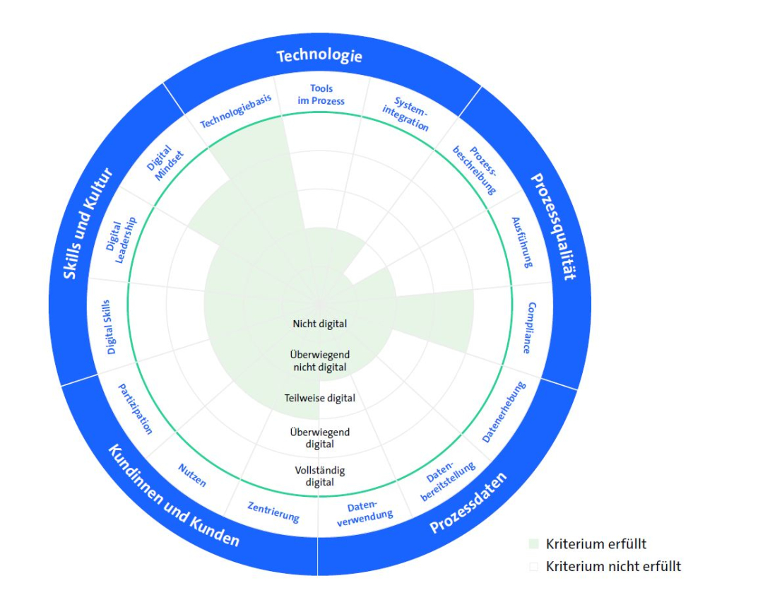 Die Arbeitskreise »Digitale Geschäftsprozesse« und »Digitale Verwaltung« im Bitkom haben diese Frage zum Anlass genommen, sich mit dem aktuellen Thema in einem Expertengremium auseinanderzusetzen. Das Ergebnis ist ein branchenübergreifend gültiges Reifegradmodell, bei dem der Praxisnutzen im Vordergrund steht. Der erarbeitete Ansatz erlaubt es, mit überschaubarem Aufwand – ausgehend vom Nutzer – den momentan erlebten Reifegrad hinsichtlich der Digitalisierung von Prozessen zu bewerten. Über fünf Dimensionen, die je drei Kriterien mit zwei Fragen umfassen, kann der digitale Status quo eines Prozesses ganz einfach erhoben werden. Die Visualisierung des Modells (siehe Abbildung) hilft dabei, einen schnellen Überblick zu erhalten und die Ergebnisse leicht zu kommunizieren.